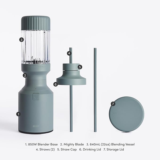 - WHAT'S INCLUDED: 850W Blender Base, Beast Mighty Blade, Blade Cleaning Brush, 22oz Blending Vessel, Storage Lid, Drinking Lid, Carry Cap, Straw Cap, 2 Straws, Straw Cleaning Brush