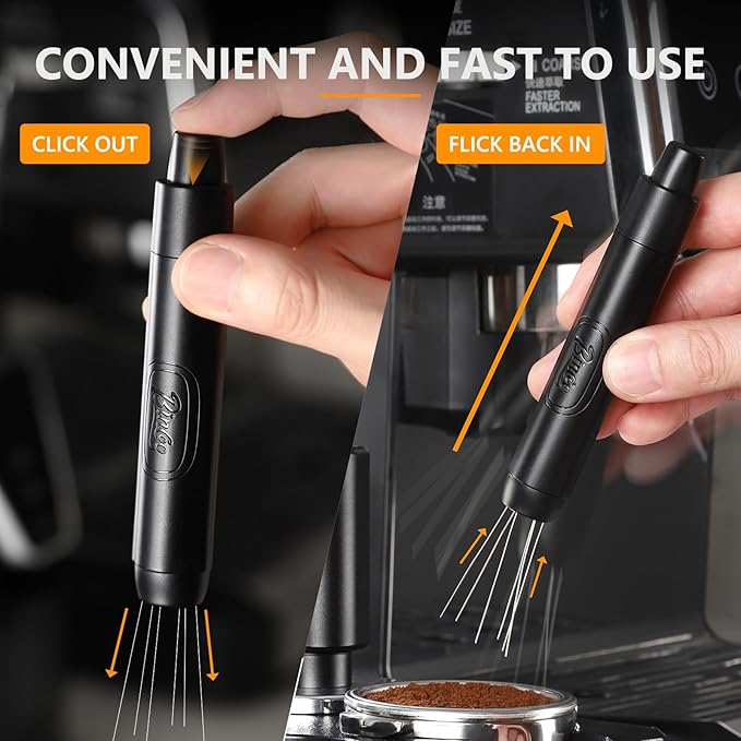 - ✔️ 【Enhanced Extraction Quality】Equipped with 6 surgical-grade 0.4mm needles (304 stainless steel) that eliminate micro-clumps traditional tools miss. Achieve barista-level density for perfect water flow through your coffee puck.
