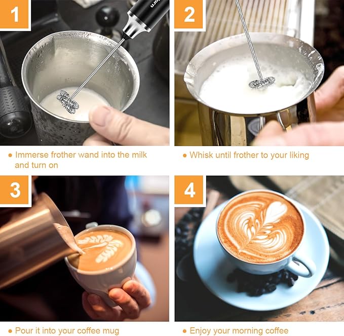 - 【Easy to Clean】Made of food-grade 304 stainless steel, the coffee frother is durable, rust-resistant and easy to clean. It's detachable design makes the clean faster and easier than others. Please note that the body of the coffee frother handheld is not waterproof, so do not immerse it in water.