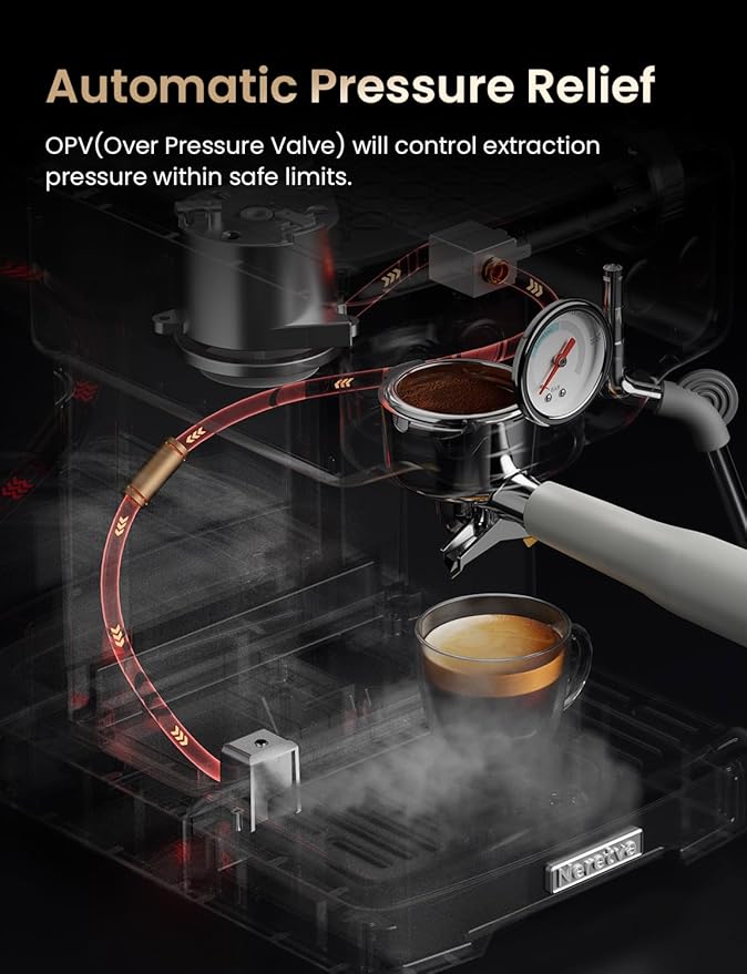 - AUTOMATIC PRESSURE RELIEF - The espresso makers have a built-in OPV (Over Pressure Valve), which serves to open automatically when the pressure is too high, releasing the excess pressure to maintain the taste and quality of the coffee. At the same time, it prevents the boiler from being over pressurized and damaged the next time it is turned on to heat.