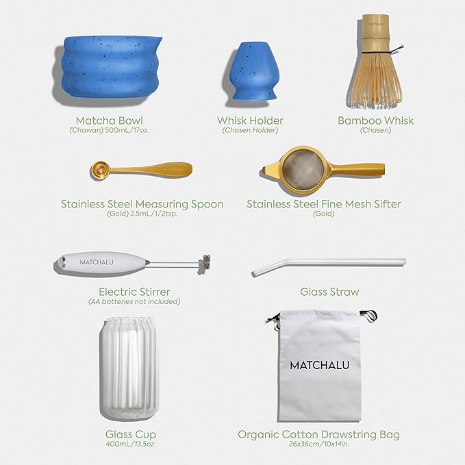 - Complete Matcha Kit: 1* Ceramic Bowl with Spout 500mL/17oz. (Chawan), 1* 120-Prong Bamboo Matcha Whisk (Chasen), 1* Whisk Holder (Chasen Holder), 1* Stainless Steel (Gold) Measuring Spoon 2.5mL/1/2 tsp., 1* Stainless Steel (Gold) Fine Mesh Sifter, 1* Electric Stirrer (not included two AA batteries), 1* Glass Cup 400mL/13.5oz., 1* Glass Straw, 1* Organic Cotton Drawstring Bag 26x36cm/ 10x14in.