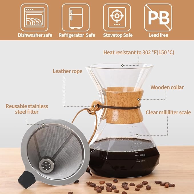 - Elegant Design - This drip coffee maker features an easy-grip handle and anti-drip spout, ensuring safe handling and precise pouring. This stainless steel mesh filter that helps extract your coffee's aromatic oils and subtle flavors instead of being absorbed by a paper filter.