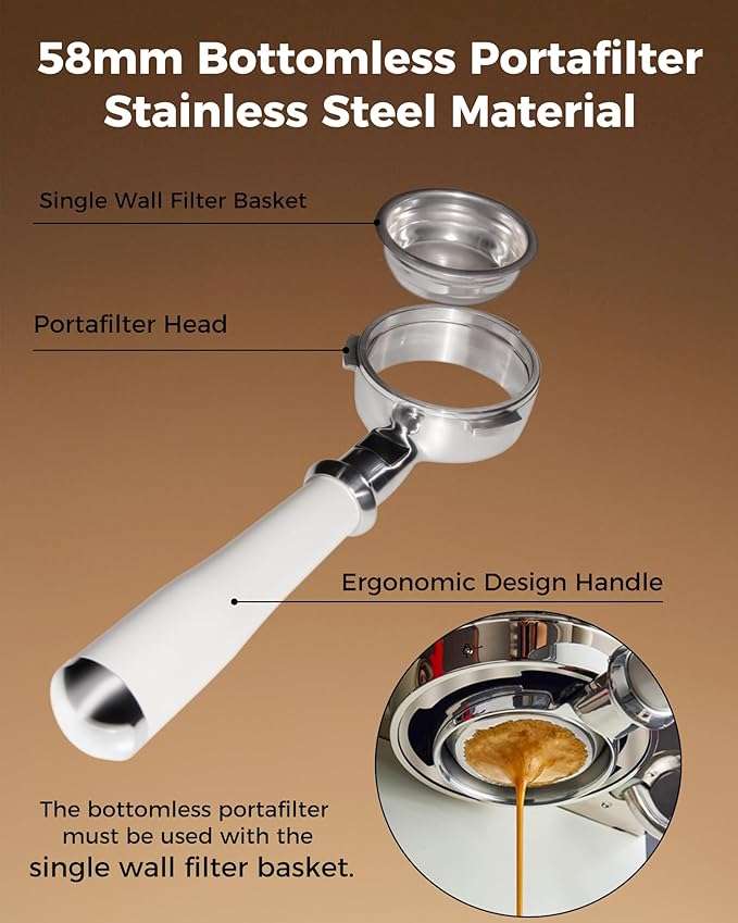 - [Extraction Improvement] The bottomless portafilter allows for a better understanding and observation of the coffee extraction process, whether your grind is wrong or you are tamping incorrectly the bottomless portafilter will let you know. You can adjust extraction parameters such as grind size, pressure, extraction time, and more accurately achieve control for a superior taste experience.