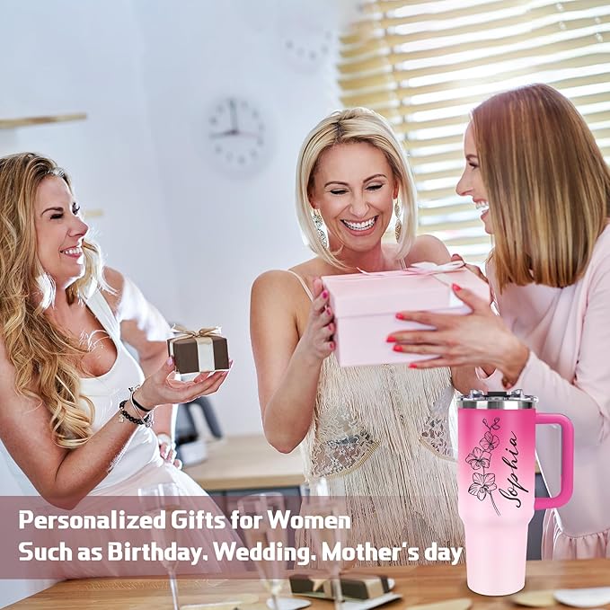 Personalized 40oz Tumbler with Handle and Straw, Custom Tumbler with Names & Birth Month Flower, Stainless Steel Travel Coffee Mug, Personalized Birthday Gifts For Women