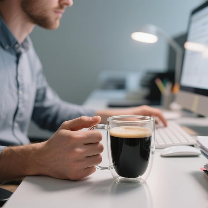 - DOUBLE WALLED INSULATED DESIGN: The glass mug is double-walled, so even if you put something cold or warm in it, the temperature won't be transmitted, and it won't condense. Espresso cup with handle design, comfortable to hold in your hand, enjoy hot and iced drinks, with innovative insulated double-wall design and modern appearance.