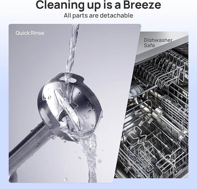 - 【Easy to Detach, Clean & Store】 - Quickly attach and detach attachments with simple clicks. The detachable parts make cleaning straightforward. Just rinse them off or toss them in the dishwasher. Wipe the main body with a soft damp cloth. The grip has a loop to hang on for easy storage
