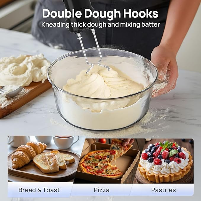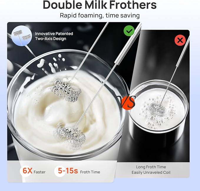 - 【Extra 3 Dual Drive Shaft Attachments】 - The innovative dual shaft design allows for faster and more thorough blending. /Double Frothers/ Froths 200ml of milk in just 5-15s, 6x faster than others; /Double Beaters/ 4x faster to whip eggs. Even function as hand mixers for batter, dough, and other heavy mixtures; /Double Hooks/ Kneading thick bread or pizza doughs and mixing batter without the effort