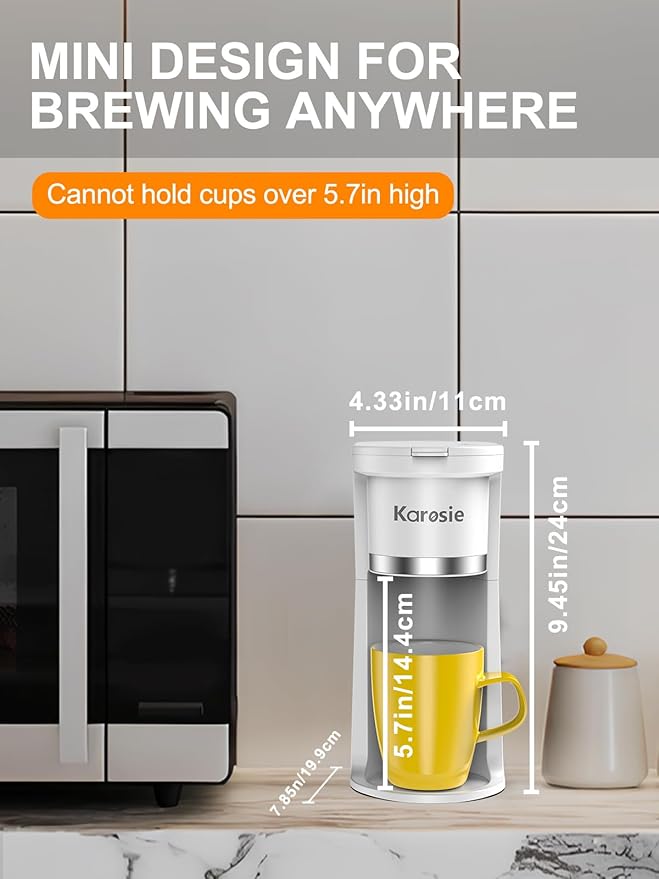 - 【Safety & Portable】The small coffee maker is made from BPA-free and heat-resistant materials to ensure durability and safety. At 9.45" height and 4.33" wide, the slim and space-saving design is great ideal for small kitchens, dorm rooms, RVs, and office spaces