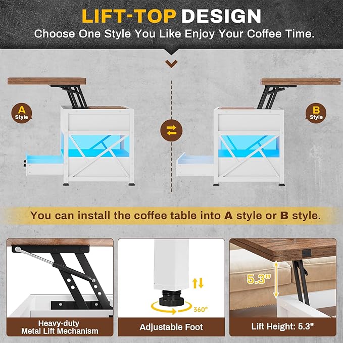 - 【What you get?】The lift top coffee table with 4 lifting methods also has partitioned hidden storage compartment, open storage shelf, 2 drawers and LED light. Coffee table for living room can be used when eating, working, studying and playing games, quietly and easily lift the table top to facilitate small room to make full use of the space.(Caution: Lower table top must be raised first to avoid damage. )
