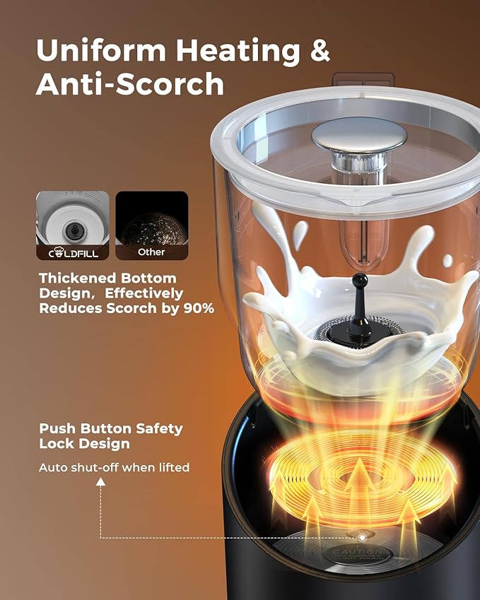 - 【Full-Surface Heating to Prevent Scorching】No more uneven heating or residue buildup! Our stainless steel milk frother uses induction heating and a conduction plate to evenly heat dairy or plant-based milks. Perfect for delicate milk steamer tasks or thick hot chocolate, it helps prevent scorching and ensures consistent results—ideal for both milk warmer and frother routines and indulgent cocoa blends.