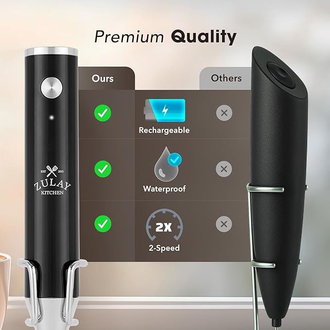 Zulay Kitchen Lux Rechargeable Milk Frother Handheld, 4 Included Whisks - Powerful 2-Speed Motor, Fully Waterproof, 2000mAh Battery - Drink Mixer For Latte, Cappuccino, Matcha, Protein Powder