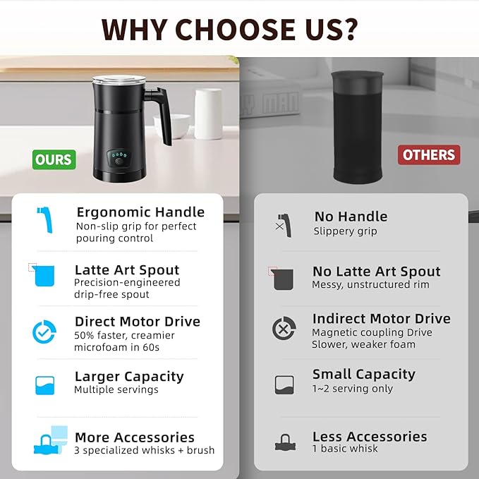 - ๐๐ข๐ ๐ก๐ญ๐ง๐ข๐ง๐ -๐ ๐๐ฌ๐ญ & ๐๐ฎ๐ฉ๐๐ซ๐ข๐จ๐ซ ๐ ๐ซ๐จ๐ญ๐ก๐ข๐ง๐ โ Our motor-direct-drive whisk (vs. magnetic-coupling motors) delivers 30% finer bubbles. In cold foam mode achieve barista-grade microfoam in 1 minute, 50% faster, cutting time in half while creating silkier, denser foam for professional texture.