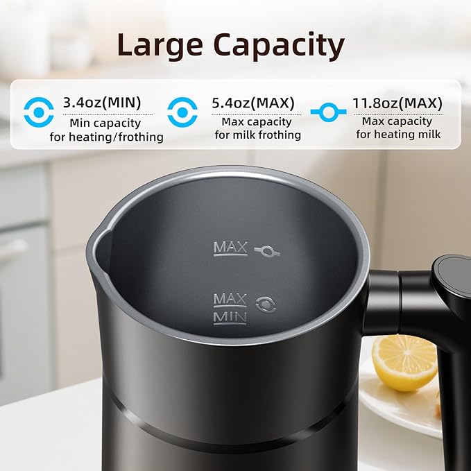 - ๐๐๐ซ๐ ๐ ๐๐๐ฉ๐๐๐ข๐ญ๐ฒ โ With 18.6oz stirring cup, safely heat up 11.8oz milk or froth 5.4oz milk at once, catering to multiple servings. Ideal for family gatherings, office use, or entertaining guests with your coffee frother.