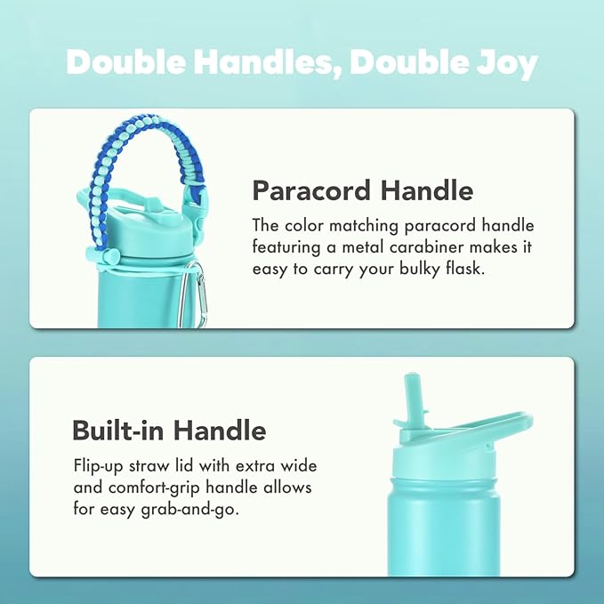- ON-the-GO PARACORD HANDLE: Featuring a secure and soft-touch paracord handle, our steel water bottle is ideal for on-the-go hydration. The detachable paracord strap and carabiner attach easily to belts, backpacks, strollers, and more, making it convenient to take the sports water bottle to your favorite workout studio or a day at the beach with family or friends.