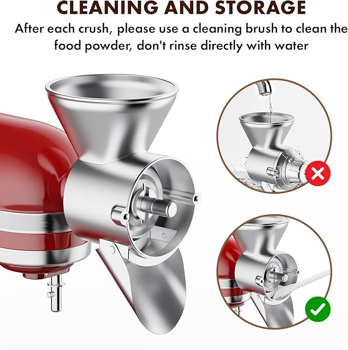 - Easy to Use & Clean: Designed for hassle-free operation, this kitchen aid flour mill grinder attachment installs quickly onto your KitchenAid mixer. The detachable grinding chamber and included cleaning brush simplify maintenance. Handwash only—do not immerse in water or use a dishwasher.