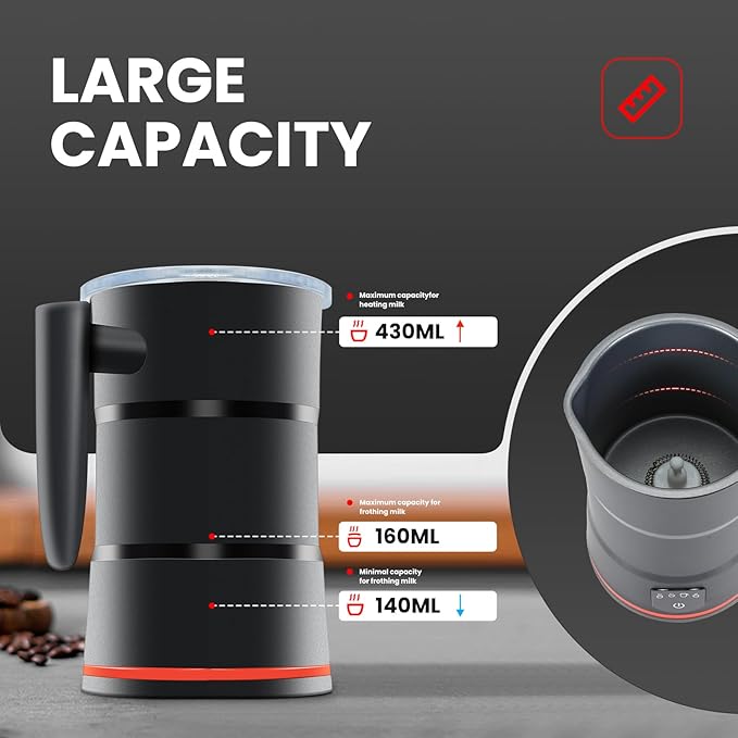 - 【Huge Capacity】 Froths up to 5.6oz (160ml) of milk and heats up to 15.1oz (430ml) of milk or hot chocolate—The milk frother is perfect for creamy lattes, cappuccinos, or cozy cocoa moments.