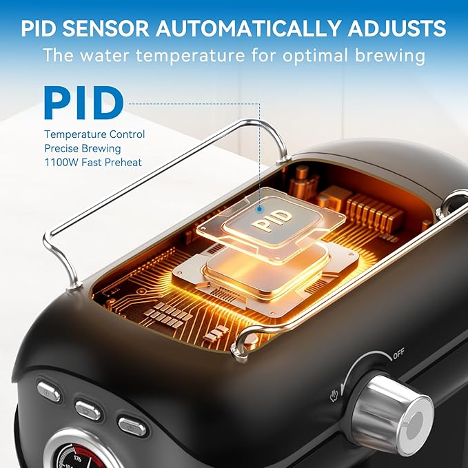 - PID Temperature Control for Consistent, Balanced Flavor :Our advanced PID controller maintains water temperature at the ideal range for brewing, guaranteeing a consistent and balanced cup every time. Heating Note: While the machine pre-heats in approximately 60 seconds, for ultimate temperature stability, we recommend running a brief hot water cycle through the portafilter without coffee before your first shot