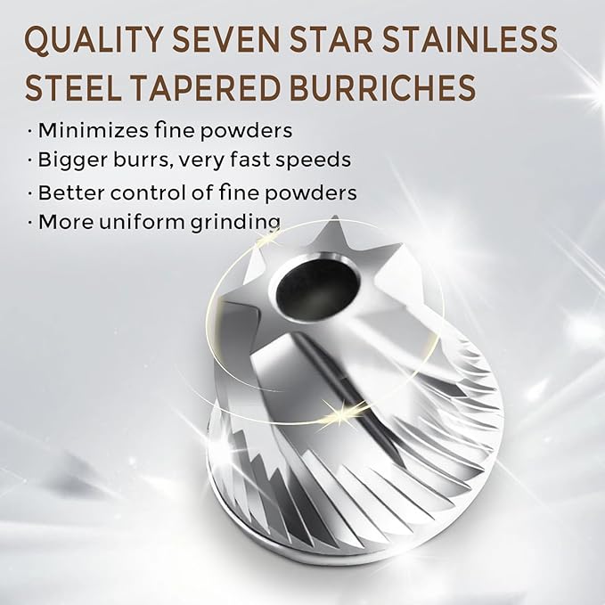 - Upgraded 7-Star Grinding Core: Coffee grinder adopting high hardness SUS420 stainless steel conical blade, 7-star blade structure, realizing 7 layers of cutting, making the grinding more even; Double bearings fix the center shaft, zero wobble and zero offset when grinding. Ensure your coffee beans achieve the best taste through consistent and fast grinding, retaining the flavor of the coffee beans.