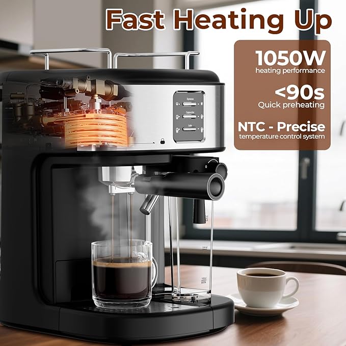 - Strong extraction, professional taste: equipped with 20bar strong pressure pump, in-depth extraction of the essence of the coffee beans, easy to replicate the espresso espresso, each mouthful is full of rich aroma and dense crema.