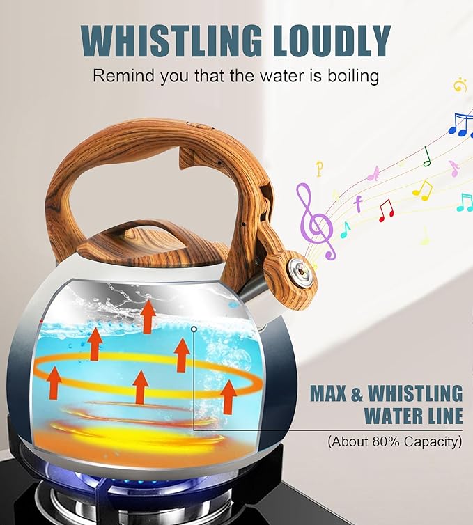 - 【Loud Whistling Sound】 The tea kettle stovetop whistling has a loud whistle. Even in a noisy environment, the loud whistle can easily remind you that the hot water is ready. You can enjoy other happy times while boiling the water, such as watching movies and listening to music.The water level in the kettle should be lower than the outlet to ensure that the whistle can work properly.
