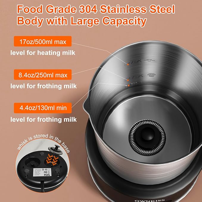 - 【Perfect Gift for Coffee Enthusiasts】 Whether you're a seasoned barista or new to coffee making, the OWNKISS milk frother is a must-have kitchen upgrade. Its sleek design, user-friendly one-touch interface, and versatile functionality make it an ideal gift for anyone who loves latte art, creamy hot chocolate, or café-style drinks.