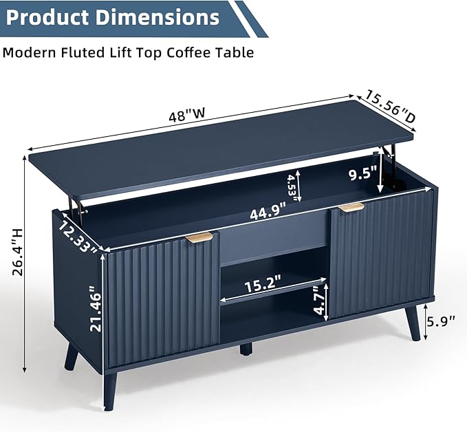 LEYAOYAO 48" Fluted Lift Top Coffee Table with Hidden Storage & Adjustable Shelves, Lifting Tabletop Large Rectangular Coffee Tables, Mid Century Modern Wood Center Table for Living Room, Nave Blue