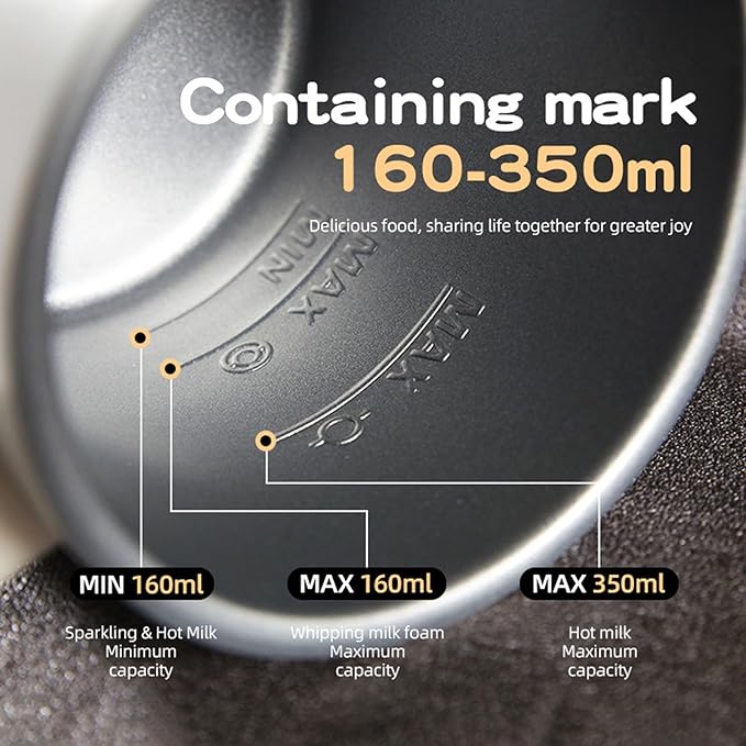 - Capacity —MAX HEATING capacity is 350ml (12.3 oz), MAX FROTHING capacity is 160ml (5.6 oz).