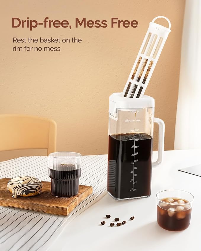 - Convenient Design: Cold brew pitcher and its filter are designed with precise scales on its body for accurate coffee making ratio. This coffee maker brewerโs filter with removable bottom cover is easier to clean residues compared with all-in-one filter. Top cover on powder compartment prevents coffee powder floating, ensures thorough immersion, and keeps lid clean. Filter can be placed at spout to prevent spills, enhancing convenience and cleanliness.