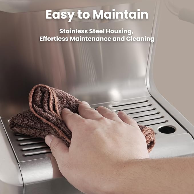 - 𝐈𝐝𝐞𝐚𝐥 𝐒𝐢𝐳𝐞 & 𝐃𝐮𝐫𝐚𝐛𝐥𝐞 𝐃𝐞𝐬𝐢𝐠𝐧 - Full Stainless steel housing, stylish and durable, offering modern aesthetic that complements any kitchen decor. Additionally, the cappuccino machine's space-efficient size ensures a comfortable fit on countertops of all sizes.