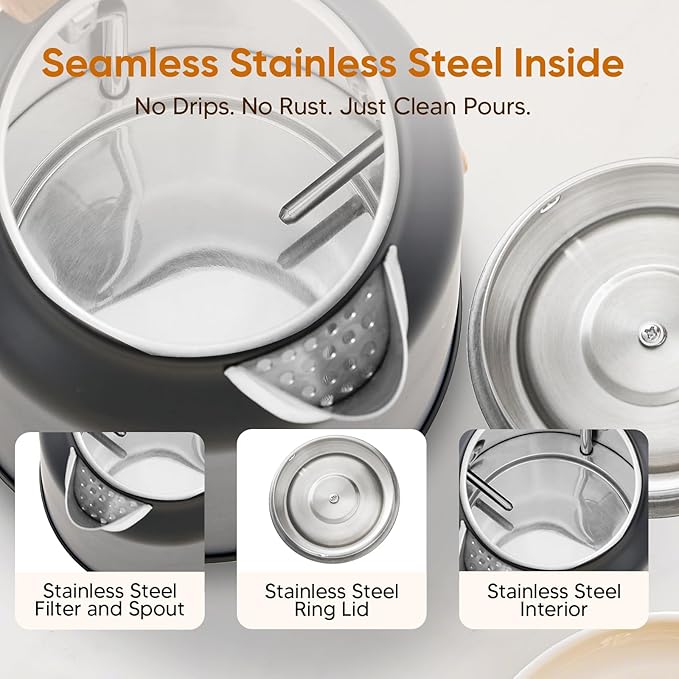 - 【Safe & Durable 304 Stainless Steel】 – Crafted with food-grade steel, this hot water kettle electric ensures no plastic touches water. Its seamless design prevents leaks, while the stainless spout filter keeps every pour pure and smooth. Built to last, this kettle delivers confidence with every use.