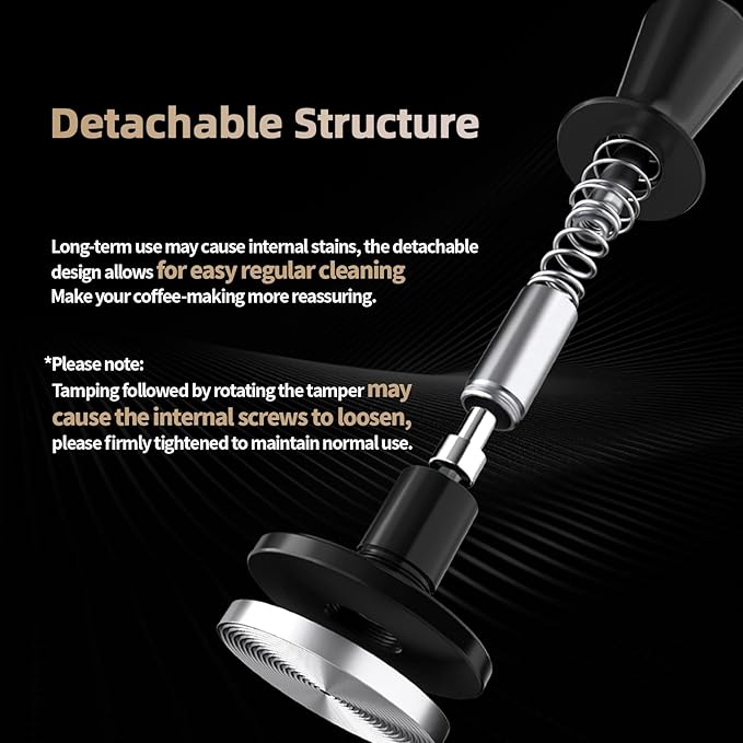 - Automatic Reset: The reset spring inside the spring loaded tamper allows it to automatically rebound and reset after tamping, without the need for manual reset or adjustment. Reduce the uneven compaction effect caused by uneven strength、hand fatigue or negligence of novice coffee lovers.