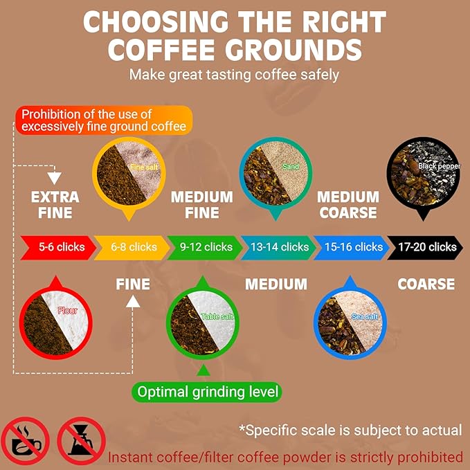 - NOTE (Regarding the heating method, please read the instructions before use) : 1. The best grind is medium-fine. Avoid using instant coffee, filter coffee powder, or other extremely fine grinds, Novices should read the manual and watch the usage video guide before use