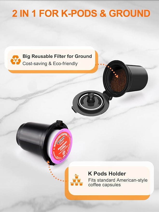 - 【Brew in 2 Ways】Karosie single serve coffee maker is compatible with both K pod and ground coffee, which satisfies the diverse taste needs of coffee lovers. With a brewing capacity of 6–12 oz, it features a one-button operation that fast brews a fresh cup of hot coffee. Great for chaotic mornings when you need caffeine ASAP