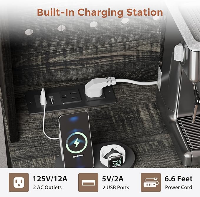 - 47‘’ WIDE COUNTERTOP WITH CHARGING STATION: With a 47.3-inch wide countertop, this coffee bar offers ample space for your essentials. Equipped with two AC outlets and two USB ports, it easily supports appliances like coffee makers, microwaves, and toasters. Say goodbye to outlet shortages and enjoy the convenience