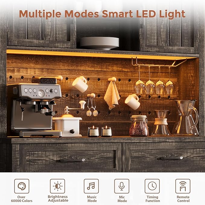 - MULTI-FUNCTION RGB LED LIGHT: This coffee bar cabinet features a built-in smart RGB LED light strip, controllable via app or remote. Choose from over 16 million colors, 20+ preset effects, and multiple smart modes to create the ideal ambiance. Whether hosting a party with vibrant hues or providing a nightlight for children, this kitchen hutch blends functionality with style