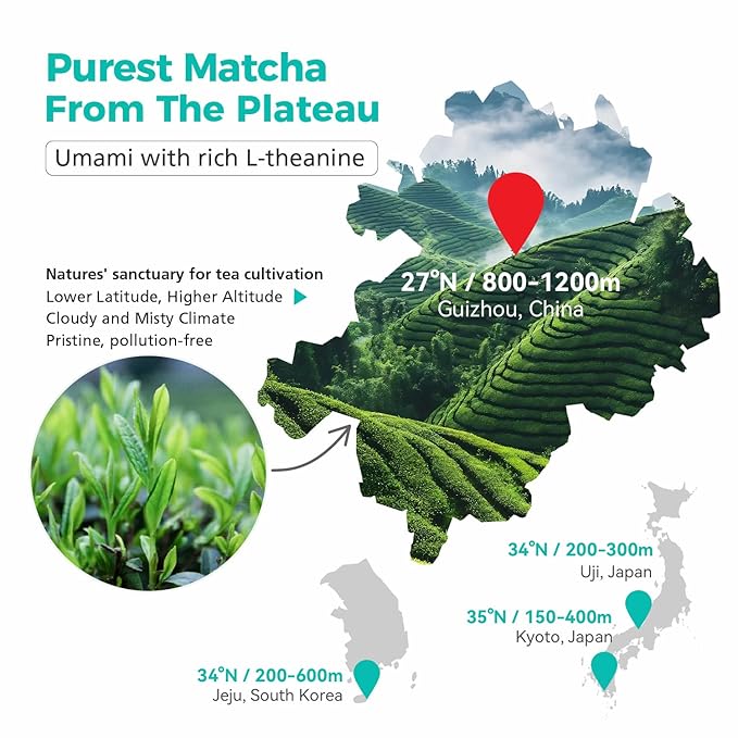 - ✓ Authentic Matcha Powder: Harvested from the pristine plateau of Jiangkou in Guizhou, China - a pollution-free natural sanctuary located near the UNESCO-listed Fanjing Mountain, where ancient tea trees have thrived for over 1,000 years - and crafted by generations of tea masters who have passed down the tradition of tea-making through the ages.
