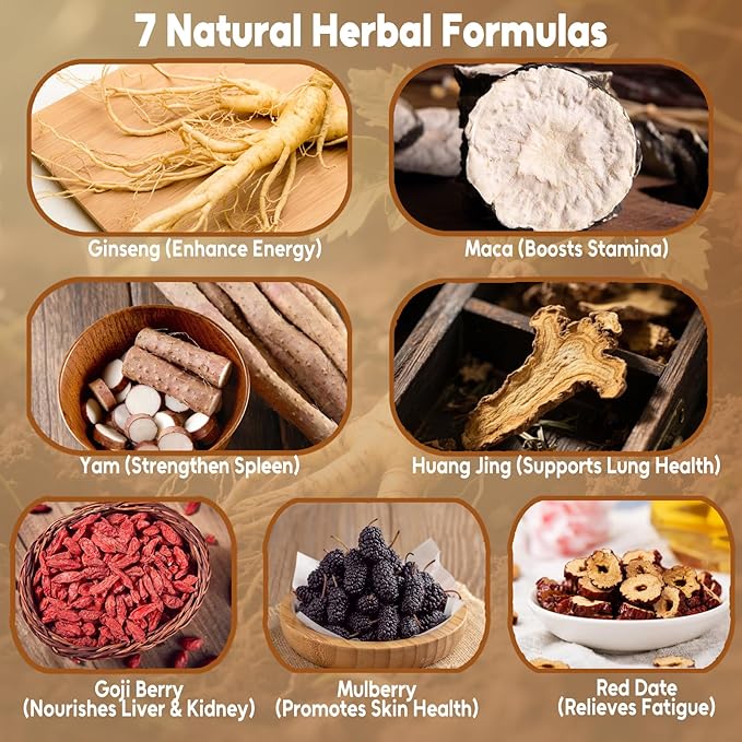 - Recharge with Premium Herbal Blend:Our ginseng six treasure tea expertly combines ginseng, goji berry, maca, huangjing, red date, mulberry and yam, for a naturally invigorating herbal tea