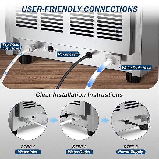 - 【Effortless Setup with Full Accessories Included】This ice maker includes everything you need: inlet hose, drain hose, quick-connect fitting, premium water filter, and ice scoop. Just connect the hoses—the machine fills and drains automatically, making the setup process hassle-free.