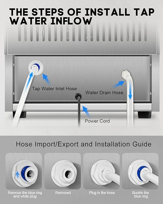 - 【Easy Installation & One-Touch Operation】Installation is simple with the included inlet hose, drain hose, and quick connectors—just hook up and start making ice automatically. Important Note: The stainless steel silver model is protected by a scratch-resistant film that appears white. You may peel it off or leave it on based on preference.