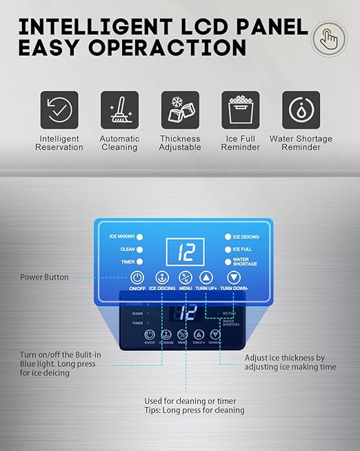 - 【Smart LCD Control Panel with Multi-Functions】Enjoy full control with an intuitive LCD display, offering one-click operation for: 24-hour、timer reservation、Automatic self-cleaning 、De-icing function、Built-in blue light, Malfunction alert. Adjust ice-making time (+/-) to control cube thickness and tailor ice to your needs.