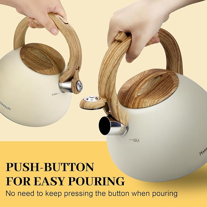 - Anti-Rust: MARSKITOP tea kettle stovetop is made of food-grade stainless steel to resist corrosion and rust, ensuring longevity and durability. It features a cream white color finish that withstands temperatures up to 500°F without discoloration.