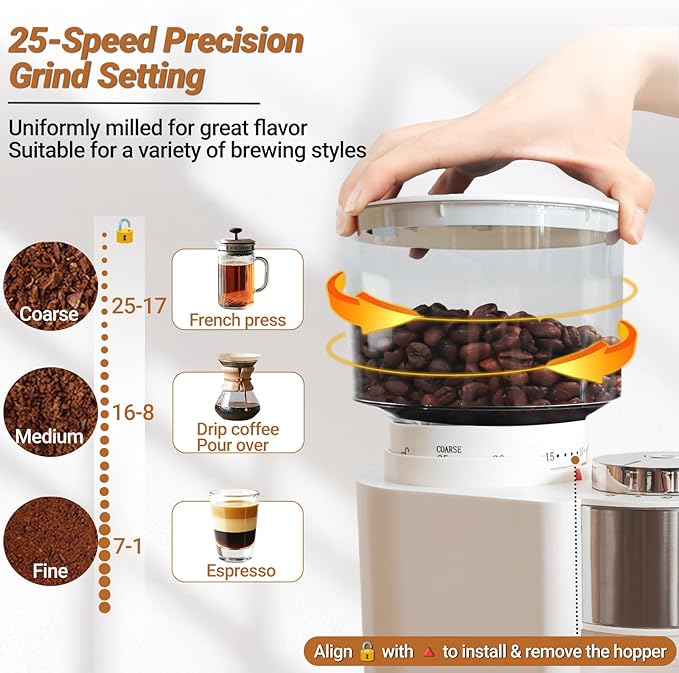 - Easy to Clean: Removable bean hopper, bean hopper lid, c, grinding chamber, grinding chamber lid and the upper burr can be cleaned with warm water (no soaking or machine washing), equipped with special cleaning brush. Wipe the body with a damp cloth and dry with a soft, dry cloth. After use and before cleaning, please make sure to disconnect the power, and regularly use the cleaning brush to clean the grinding disk residual powder to maintain the best grinding condition