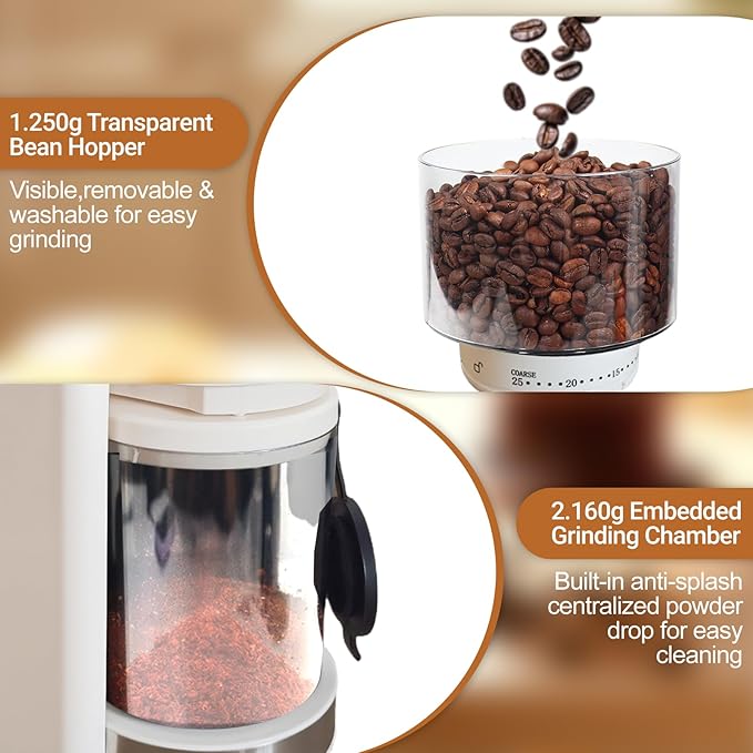 - Large Capacity Anti-Static Design: The grinder is equipped with a 250g large-capacity bean hopper and a 160g embedded grinding chamber, which adopts a centralized powder drop design, together with a sealed silicone lid, to ensure that the coffee powder is freshly preserved. Upgraded anti-static technology effectively prevents powder from flying and sticking, keeping the operating table tidy. You can change the grinding coarseness while the coffee grinder is running