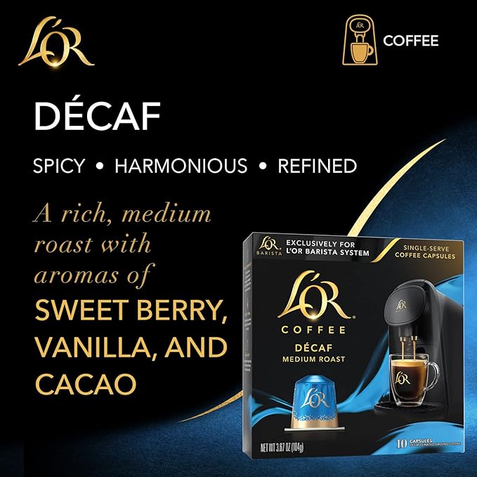 L'OR Coffee Pods, 10 Count DECAF Medium Roast, Single-Serve Aluminum Coffee Capsules Compatible with the L'OR BARISTA System & *Nespresso Original Machines, 10 count (Pack of 1)