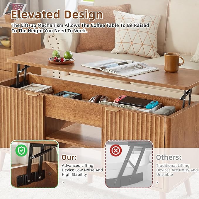 - [Lift Top Coffee Table] This coffee table with storage raises the table top to a more comfortable height for your convenience. The lifting mechanism features high-quality hinges with gas support rods, allowing effortless height adjustment while ensuring stability and durability.