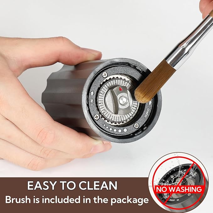 - Easy to Clean--The packaging includes coffee grinder x 1, clean brush x 1, cloth bag x1, After grinding coffee powder, a cleaning brush can be used to quickly clean the coffee powder inside the grinder. Please do not rinse stainless steel burr with water.