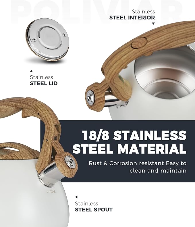 POLIVIAR Tea Kettle, 2.7 Quart White Finish with Wood Pattern Handle Loud Whistle Food Grade Stainless Steel Teapot, Anti-Hot Handle and Anti-Rust, Suitable for All Heat Sources JX2025-BW30