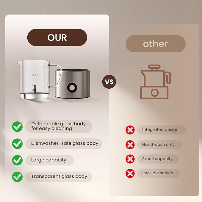 - Transparent Glass Jug with Big Capacity: Having more fun when watching the whole foam making process through the transparent jug made by glass. Having this milk steamer, you can simply pour milk into the jug for frothing, and also pour milk for heating milk. Both operation keeps you a quiet environment, no worry to bother you when working