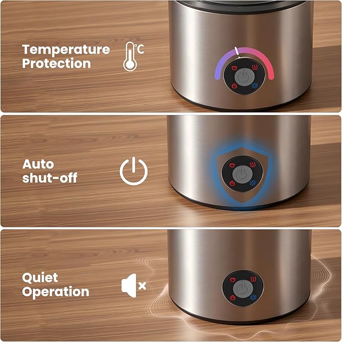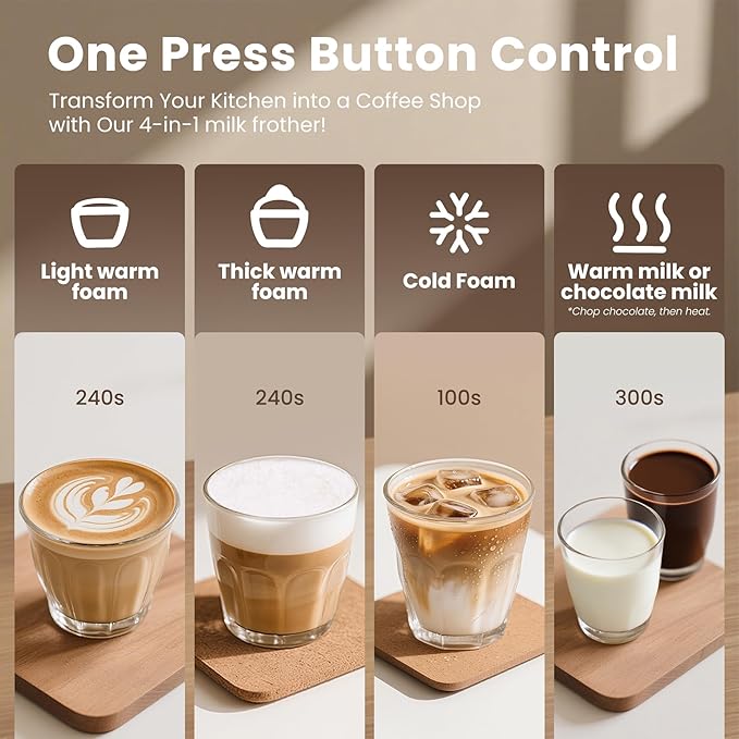 - 4 in 1 Multifunctional Frother with Simple Operation: This milk frother and steamer is able to provide cold foam, warm thick foam, warm soft foam, and even hot milk or chocolate milk. One button control only, simple to operate. Please use dairy milk for better foam (The voltage is 120V)