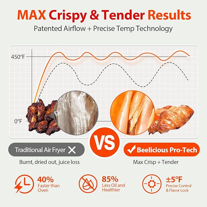 - 【Easy-view Window with Light】User-Friendly top view design, helps you monitor cooking progress anytime without pulling out the basket. Cook more comfortable and efficient with Beelicious Pro airfryer!